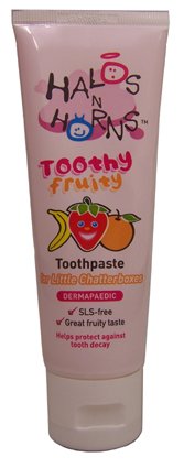 Halos N Horns Toothy Fruity Toothpaste is a safer way to fight decay. Dermapaedic with no SLS. Fights tooth decay with a great fruity taste.