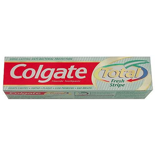 Colgate Total Fresh Stripe Flouride Toothpaste Long Lasting Anti-Bacterial Protection Fights cavities, plaque, tartar, gum problems and bad breath. Colgate Total Fresh Stripe has a unique combination of a sustained action anti bacterial system fluoride and fresh mint flavour, so it gives you long lasting protection in between brushings and fresh breath. Now Colgate Total Fresh Stripe is also the only toothpaste clinically proven to protect above and even below the gum line. Its unique, patented anti bacterial formula works so effectively fighting harmful bacteria on the surface, it helps prevent them from getting below the gum line. Long Lasting Anti-Bacterial Protection: It has been clinically proven that Colgate Total Fresh Stripe provides long-lasting, anti-bacterial protection against: * Cavities * Tartar * Plaque * Gum Problems * Bad Breath As with all medicines, if you experience any untoward problems, please consult your dentist or doctor. Warning Keep out of reach of children.