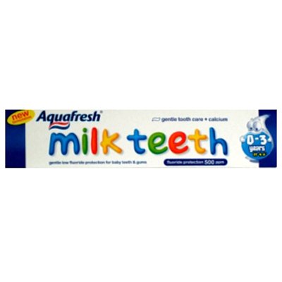 Aquafresh Milk Teeth has the lowest fluoride content in their range (500 ppm fluoride). Suitable for 0-3 years.